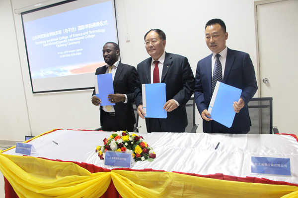 在中乌双方政府领导和现场来宾的见证下,山东科技职业学院院长刘桂玉、创造太阳乌干达石油学院约瑟夫·坎耶西杰、乌干达阳光地带印染有限公司董事长孙连忠,分别作为共建方代表,共同签署了《山东科技职业学院东非(乌干达)国际学院协议书》。