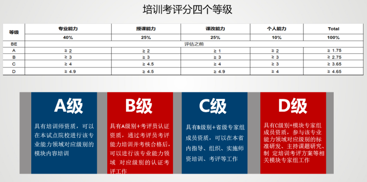 完善“四维度”师资评价机制。建立了多维度、多等级的师资培训评价机制。从专业能力、授课能力、考评能力、课改能力四个维度对教师能力进行考评,并按照A、B、C、D四个等级逐级递升。