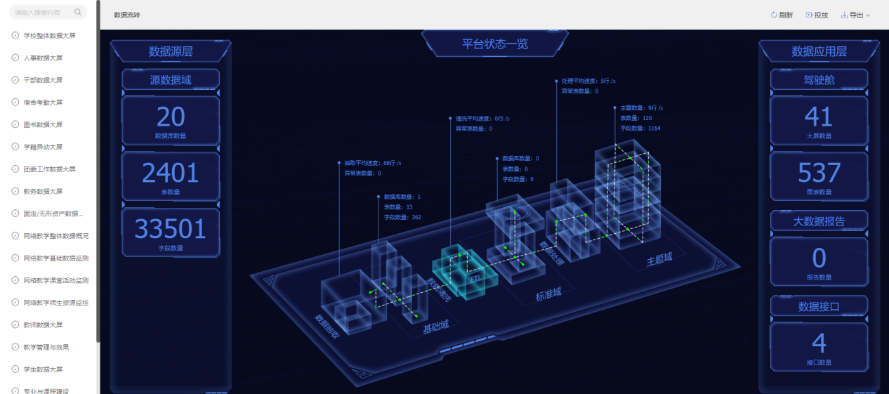 在制定学校数据标准的基础上,对各业务应用系统数据进行采集、清洗和整合,建立起全量的数据中心和大数据平台,同时树立数据资产的理念,确定每一条数据的生产者、使用者和管理者,建立相应的管理制度,提高数据的质量,保证数据的安全性,实现了数据的集中共享和开放服务。打造以内部质量管理平台、教师发展中心、学生发展中心、专业发展中心、课程发展中心、数据大屏为核心的决策支持平台,通过数据展现了学校基本校情,通过对专业、课程、教师、学生等个体进行数据画像来进行科学评价,能够快速发现管理中的一些问题,并根据执行情况和环境变化进行改进和指标更改,从而提供基于数据分析的智能化决策支持,提高了决策的科学化水平。