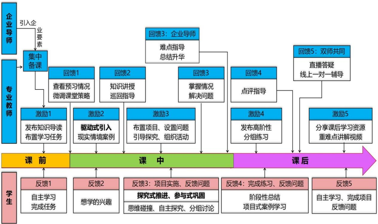 聚焦提高课堂参与度,坚持“理实一体相融合、有趣有效高参与”的原则,构建课前课中课后企业导师全程参与,课堂教学三阶段推进,借助网络平台等多种手段实现师生双向互馈的教学模式。