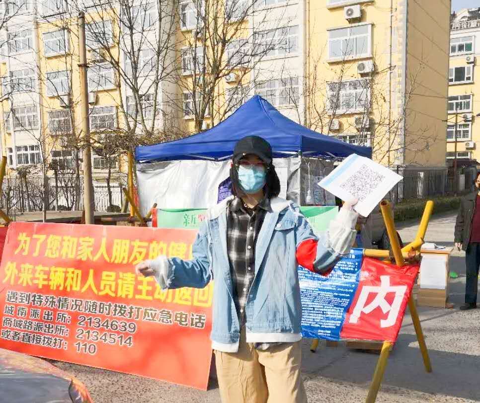 在淄博市淄川区将军路街道南苑社区的劝返点上,总会看到一个年轻的女孩在执勤。这个女孩名叫严子毓,是交通工程系19海航班一名大一新生,是个标准的“00”后,在这里执勤已经有十多天了。