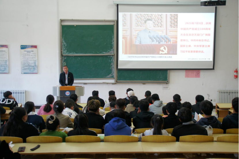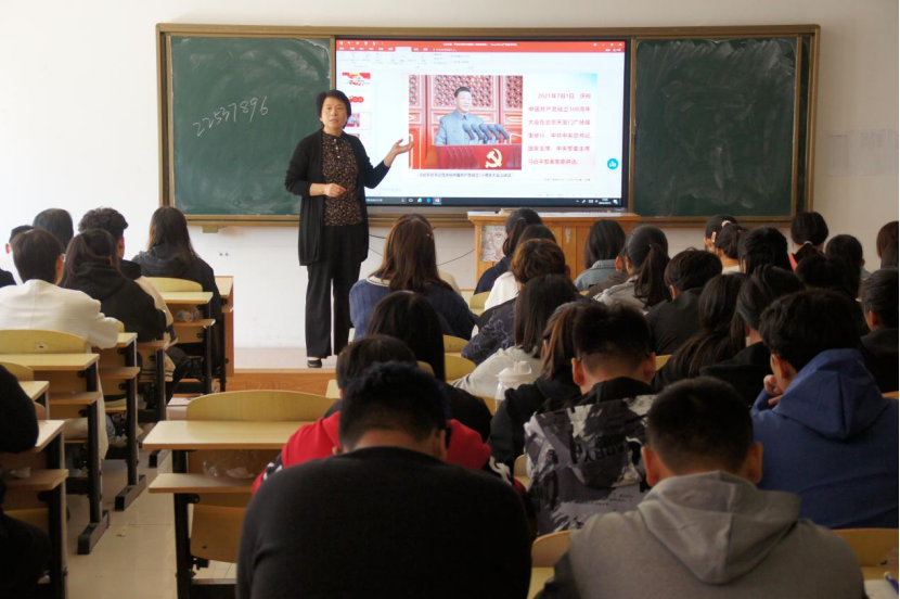 为进一步深入推进习近平新时代中国特色社会主义思想进教材、进课堂、进学生头脑,不断推动思想理论课改革创新,增强思政课的思想性、理论性和亲和力。近日,学院党委副书记于波、副院长曲健、付双美深入教学一线,以思想政治理论课《形势与政策》中的专题一:《以史为鉴、开创未来的行动指南——深入学习贯彻习近平总书记“七一”重要讲话精神》为题,分别在阶梯教室六,阶梯教室五、多媒体52004给21级的新生9个班近500名学生讲了一堂特色生动的思政课。