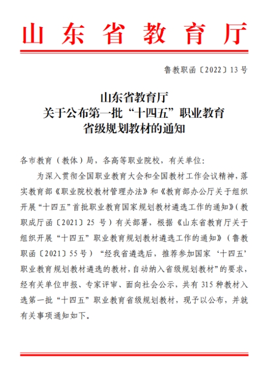 第一批“十四五”职业教育省级规划教材是山东省教育厅深入贯彻全国职业教育大会和全国教材工作会议精神,落实教育部《职业院校教材管理办法》和《教育部办公厅关于组织开展“十四五”首批职业教育国家规划教材遴选工作的通知》(教职成厅函〔2021〕25 号)有关要求的重大成果。经有关单位申报、专家评审、面向社会公示,全省共有315种教材入选。