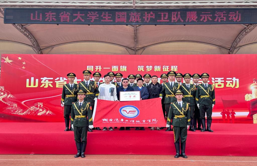 学院党委高度重视此赛事,学院武装部赛前积极组训备赛,经过初赛遴选,进入决赛。在军事教育集中训练的基础上,由武装部副部长王祖辉老师带队,李政等18名来自不同系部、年级的学生组队参加了现场展示,代表队沉着应战、压轴出场,展现了我院学子爱国热情和蓬勃朝气,最终在40支决赛队伍中成功荣获山东省大学生国旗护卫队展示活动团体一等奖。