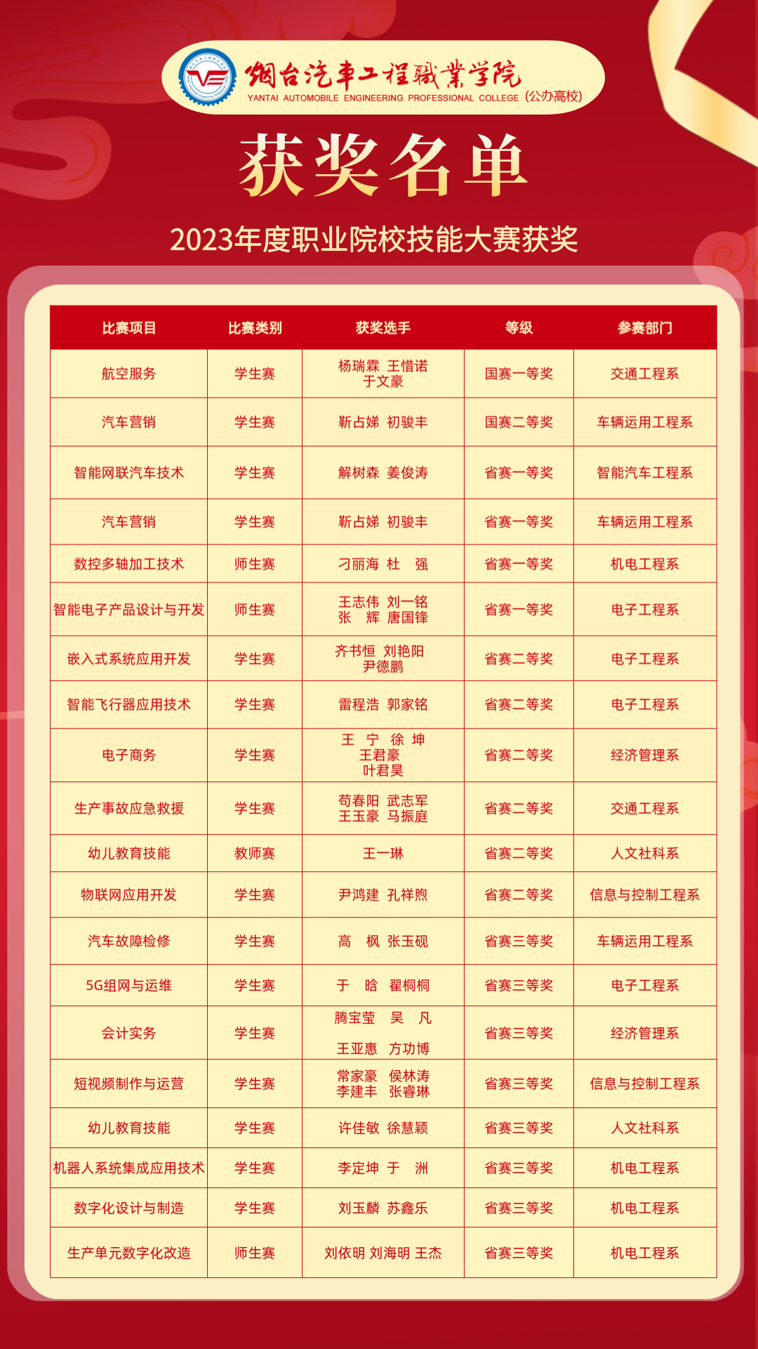 近日,第十六届山东省职业院校技能大赛高职组各项比赛相继落下帷幕,2023年度职业院校技能大赛收官。截至目前,烟台汽车工程职业学院师生获国赛一等奖1项,二等奖1项,省赛一等奖4项,二等奖6项,三等奖8项,实现新的突破。